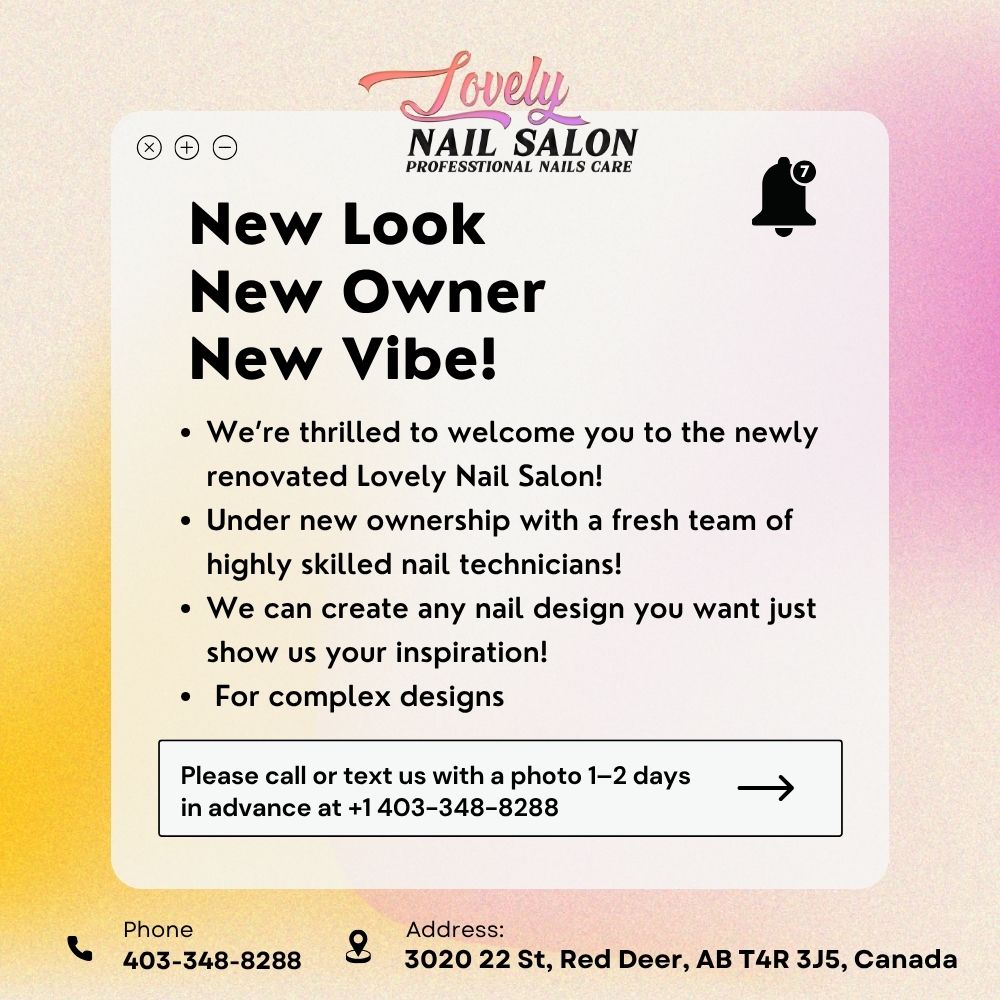 Located in the heart of East Hill Centre, Red Deer (Alberta T4R 3J5), Lovely Nail Salon is your go-to haven for luxury nail care, expert waxing services, and exceptional beauty treatments. Just steps away from McDonald’s, a gas station, and East Hill Shopping Centre with convenient parking and a highly visible storefront our salon is easily accessible and designed for your total comfort and convenience.